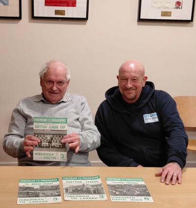 Monty is pictured here alongside Sporting Memories’ Graham Cross with several programmes from the Hibs Championship years in the early 50’s.