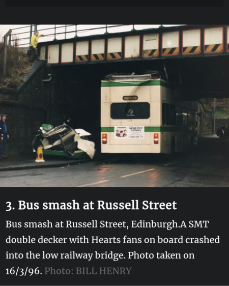 On Saturday 16th March 1996, on our way to Tynecastle for an Edinburgh Derby, our double decker bus drove directly into a low bridge on Russell Road, ripping off the entire upper deck. A deck that my brothers and I were sitting on. The sound of tearing steel and crashing glass will always live with me and it’s a miracle that nobody was seriously hurt. Amongst the chaos I remember being carried from the bus and loaded onto an ambulance where I was taken to hospital with my two brothers. We were all alive and limbs were intact. There was blood though. The next thing I remember is coming out of surgery to repair my mangled nose and apparently the first thing I asked as I came round was ‘what was the score?’ It was 1-1. Phew we didn’t lose.